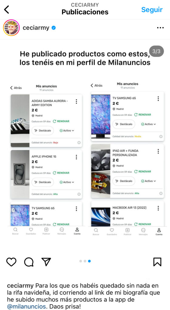 “Para los que no tuvisteis suerte en la rifa estoy publicando en mi perfil de Milanuncios iPad, Mac, iPhone, a 2€… así que si tenéis suerte os lo vendo a vosotros” explicaba Ceciarmy en su perfil de Instagram que alcanza los 3,7 millones de seguidores.