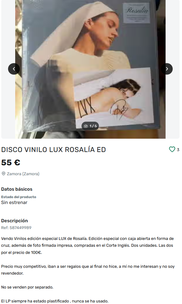 También se ha observado un aumento en la publicación de anuncios relacionados con la artista. Desde el lanzamiento del sencillo, el número de anuncios aumentó un 151% en la plataforma, donde destacan artículos como discos firmados por Rosalía, posters, camisetas oficiales del último tour y de su colaboración con el FC Barcelona, o la edición exclusiva de la revista SuperPop con el lanzamiento del álbum.