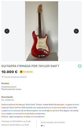 Pero, ¿qué artículos buscan los fans?, ¿cuál es el artista con el merchandising más singular? ¿Qué objetos singulares se pueden encontrar de Taylor Swift o de AC/DC? Entre las piezas más llamativas que se anuncian en la app de Milanuncios destaca una guitarra firmada por Taylor Swift por 10.000 €. Un modelo Fender que cuenta con la firma de la artista durante su gira en 2012, realizada en la rueda de prensa en la que anunció el lanzamiento de su disco Red y cuyo anuncio se realizó en Milanuncios hace unas semanas. Además, entre los últimos anuncios de estas semanas es posible encontrar también artículos de coleccionista como una moneda conmemorativa con la figura de la artista estadounidense, un billete de un dólar con la característica pose de Brian Johnson o hasta una chaqueta de cuero con ilustraciones de la mítica banda de heavy metal. Incluso el último merchandising de “The Tortured Poets Department” de Taylor Swift ya está en la segunda mano: es posible conseguir una vela aromática con la portada del CD. MA_Una guitarra Fender firmada por Taylor Swift o un dólar único de AC_DC,_ las búsquedas de los ‘swifties’ y los fans del rock aumentan hasta un 65% en la segunda mano.docx
